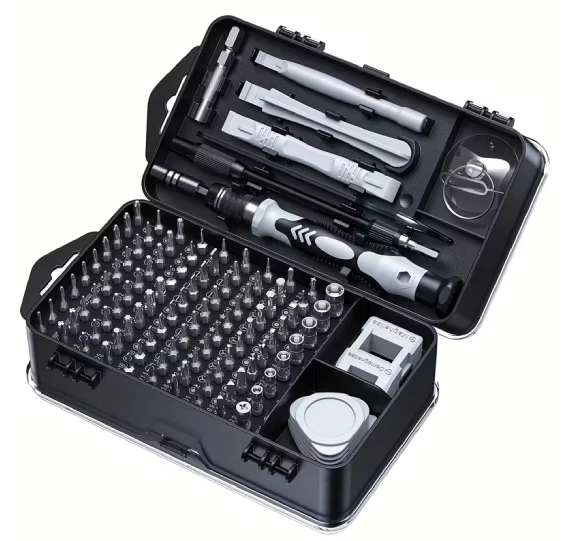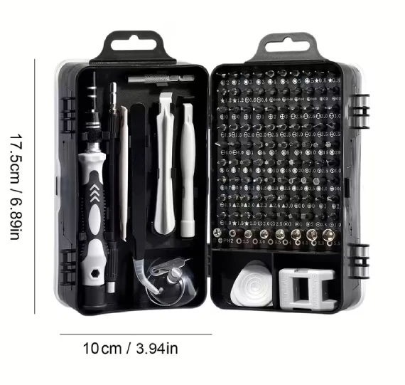 A versatile 115-piece precision screwdriver set designed for delicate repairs. Durable chrome vanadium steel, magnetic tips, and an ergonomic grip make it suitable for electronics, watches, and everyday technical tasks.