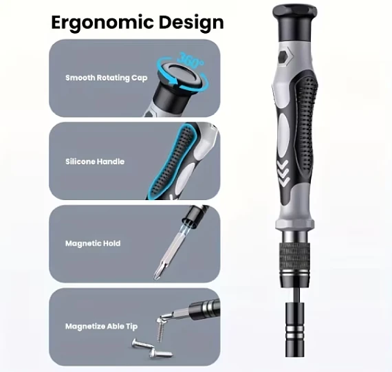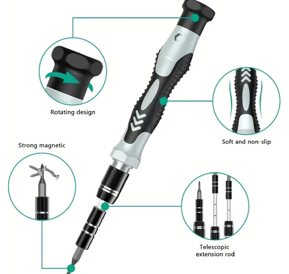 This screwdriver set is designed for detailed work where accuracy and control are essential. Featuring a comprehensive selection of bits, it allows you to handle a wide variety of small fasteners used in electronics and precision devices. The ergonomic, non-slip handle ensures a steady grip, helping reduce hand fatigue during extended use while maintaining precise control over every movement.